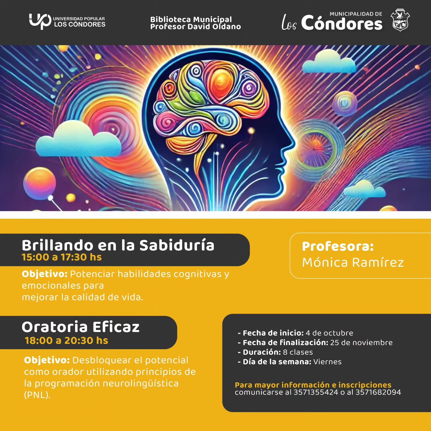 Se vienen dos nuevos cursos en la biblioteca David Oldano de Los Cóndores, Brillando en la Sabiduría y Oratoria eficáz.
